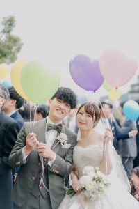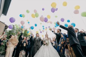 新郎新婦のバックにカラフルなバルーンを